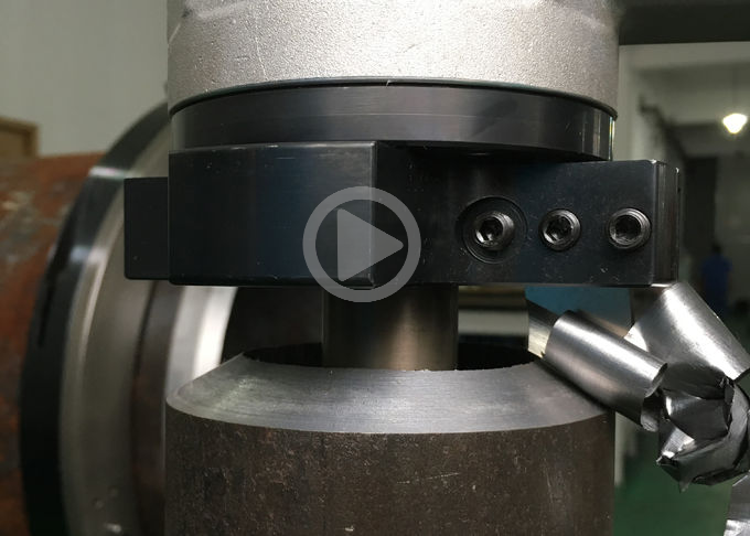 The ID-Mounted beveling operation use an expandable mandrel which is insert into the open end of the pipe. Tighten draw nut extend the expanding blocks and against the ID surface for positive mounting, self centered and squared to the bore. As the tool bit is fed into the pipe from the end, a bevel is finished which conforms to the bevel angle required. Bits are available for practically any material or beveling angle required, and bits can be custom made for any form tooling operation.